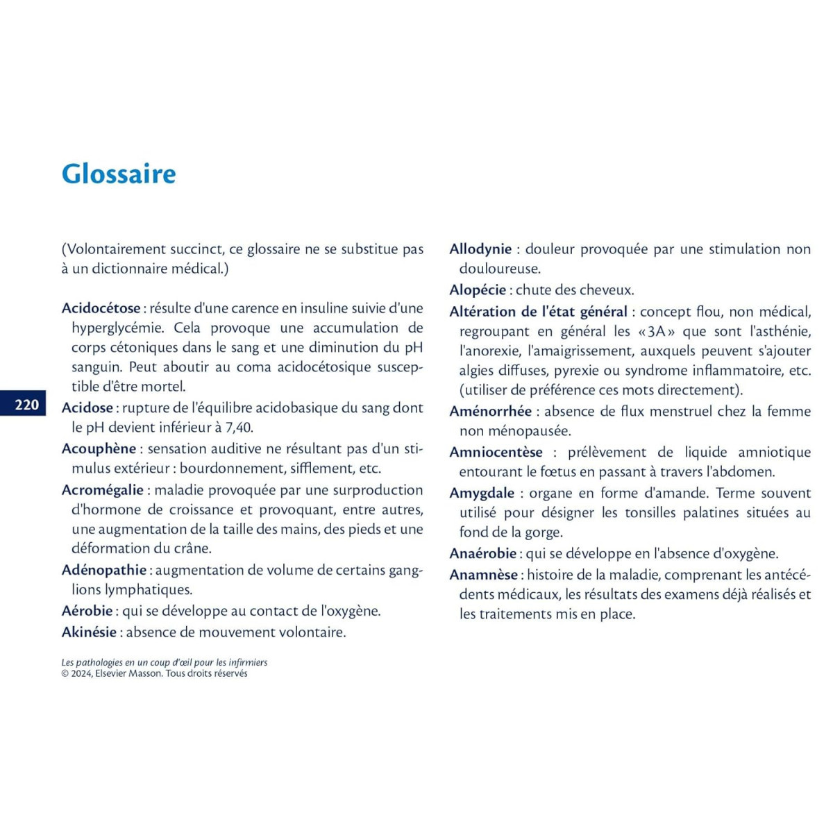 Chaque pathologie est présentée sous forme de tableaux en vis-à-vis avec la mise en évidence de mots en caractères gras pour faciliter les révisions des étudiants et son utilisation sur le lieu de stage.