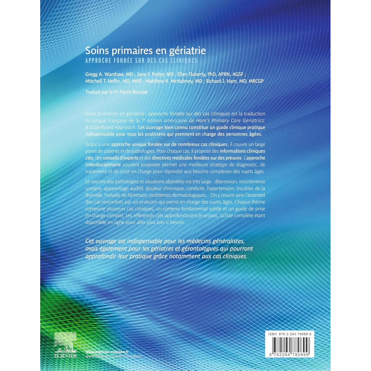 Soins primaires en Gériatrie : approche fondée sur des cas cliniques est la traduction en langue française de la 7e édition américaine de Ham's Primary Care Geriatrics: A Case-Based Approach. Cet ouvrage bien connu constitue un guide clinique pratique indispensable pour tous les praticiens qui prennent en charge des personnes âgées.