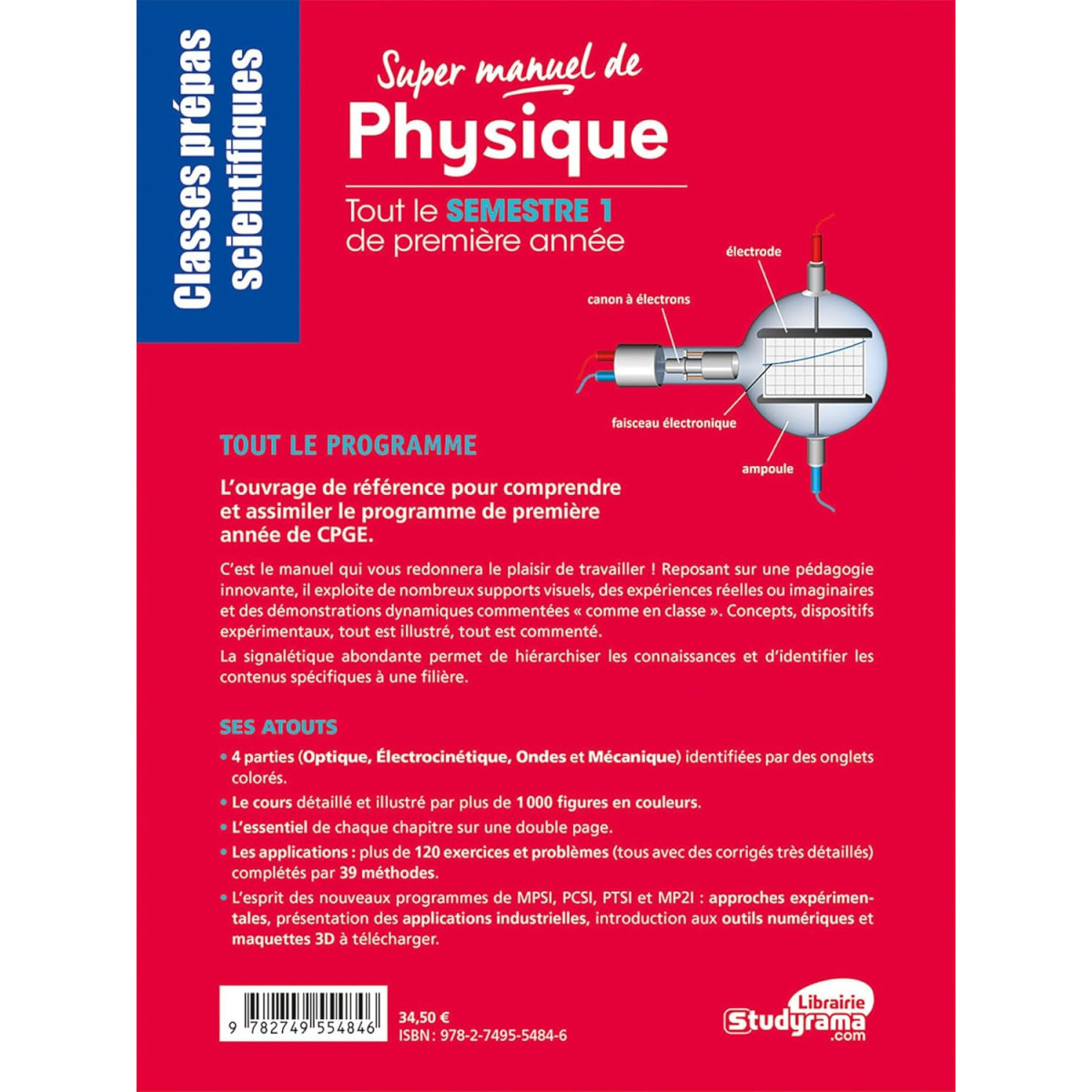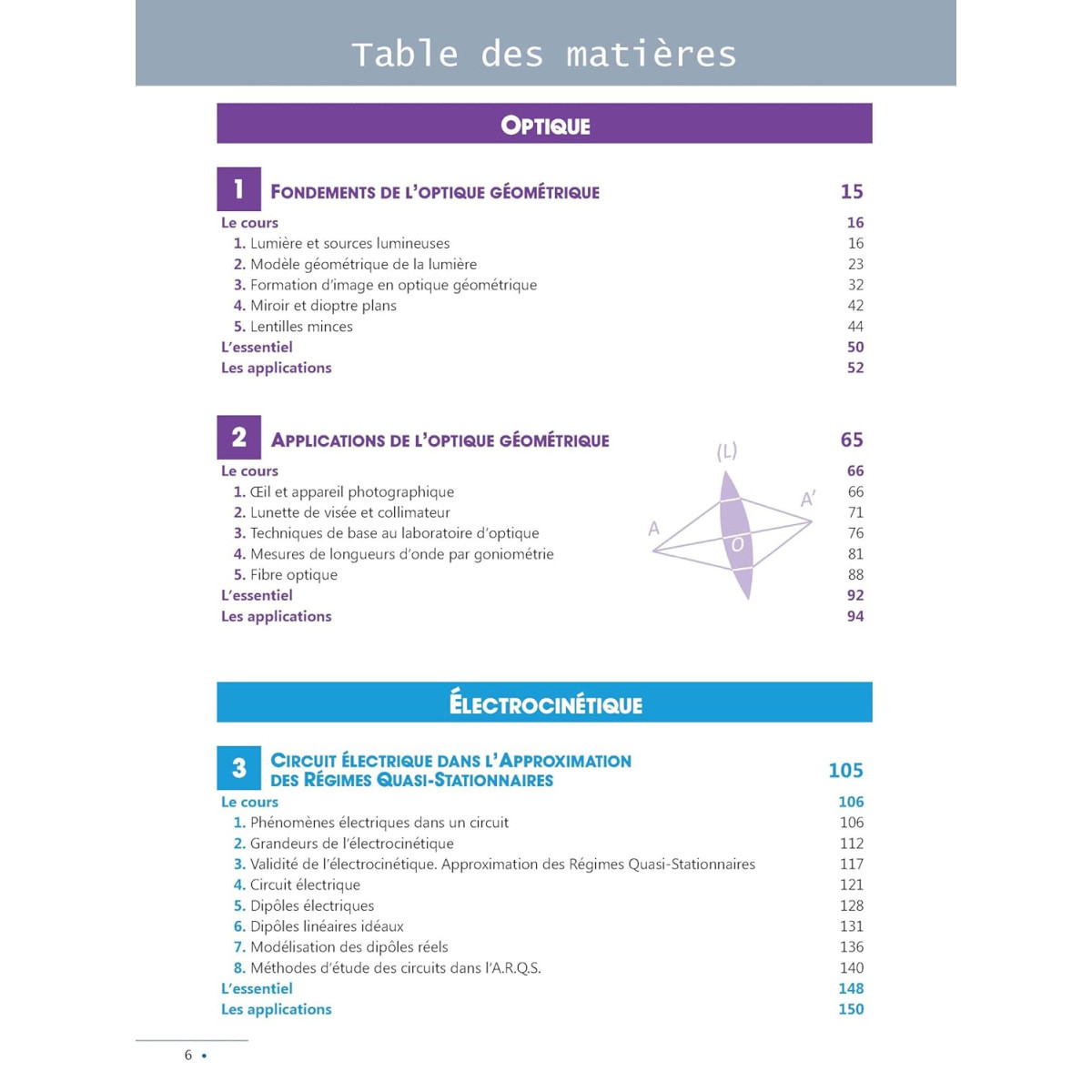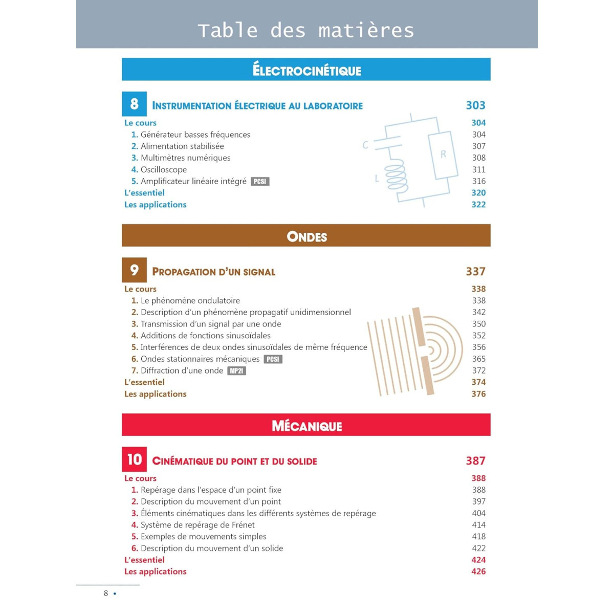 4 parties (Optique, Électrocinétique, Ondes et Mécanique) identifiées par des onglets colorés.