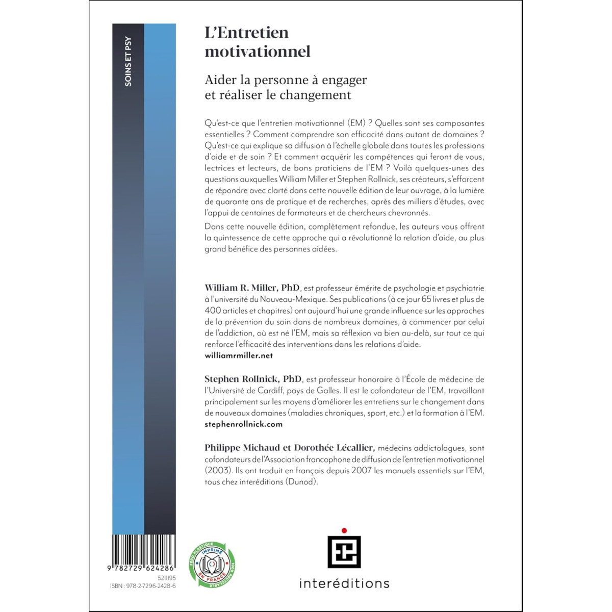 L’Entretien Motivationnel est une méthode de communication dont l’intérêt est maintenant bien démontré dans les situations où ambivalence et motivation sont au coeur des processus de changement. Évolution radicale de la relation d’aide et du travail thérapeutique, il concerne particulièrement les addictions, l’éducation thérapeutique, l’intervention sociale… à chaque fois qu’il est à la fois utile et difficile de modifier un comportement problématique, voire tout simplement de faire un choix. L’EM aide également les intervenants sanitaires, sociaux et judiciaires à accompagner leurs clients dans le changement.