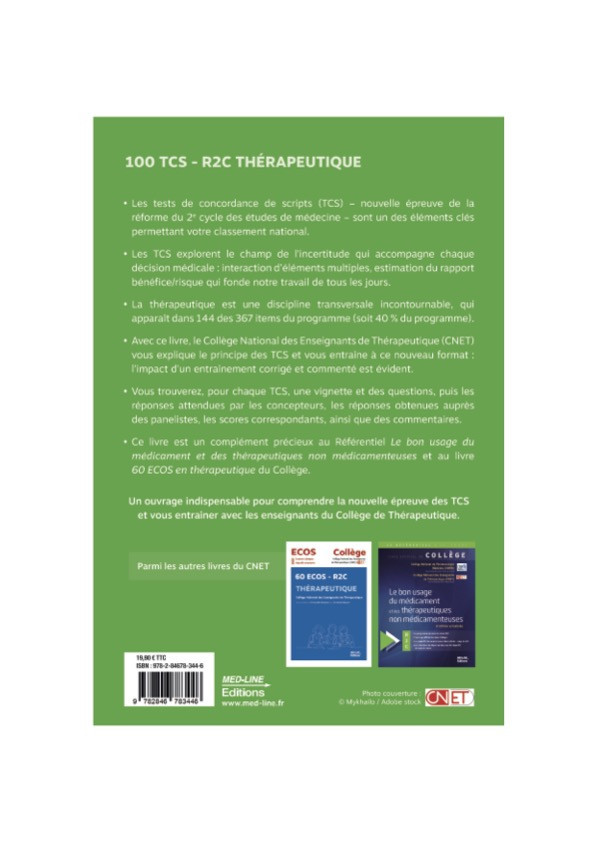 Les tests de concordance de scripts (TCS) – nouvelle épreuve de la réforme du 2e cycle des études de médecine – sont un des éléments clés permettant votre classement national. . Les TCS explorent le champ de l’incertitude qui accompagne chaque décision médicale : interaction d’éléments multiples, estimation du rapport bénéfice/risque qui fonde notre travail de tous les jours. La thérapeutique est une discipline transversale incontournable, qui apparaît dans 144 des 367 items du programme (soit 40 % du programme). Avec ce livre, le Collège National des Enseignants de Thérapeutique (CNET) vous explique le principe des TCS et vous entraîne à ce nouveau format : l’impact d’un entraînement corrigé et commenté est évident. Vous trouverez, pour chaque TCS, une vignette et des questions, puis les réponses attendues par les concepteurs, les réponses obtenues auprès des panelistes, les scores correspondants, ainsi que des commentaires. Ce livre est un complément précieux au Référentiel Le bon usage du médicament et des thérapeutiques non médicamenteuses et au livre 60 ECOS en thérapeutique du Collège. Un ouvrage indispensable pour comprendre la nouvelle épreuve des TCS et vous entraîner avec les enseignants du Collège de Thérapeutique.