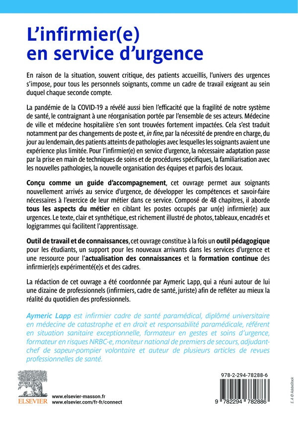 Aymeric Lapp est infirmier cadre de santé paramédical, diplômé universitaire en Médecine de catastrophe et en droit et responsabilité paramédicale, référent en situation sanitaire exceptionnelle, formateur en gestes et soins d'urgence, formateur en risques NRBC-e, moniteur national de premiers de secours, adjudant-chef de sapeur-pompier volontaire et auteur de plusieurs articles de revues professionnelles de santé.