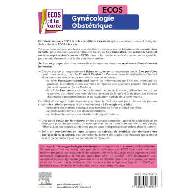 L'ouvrage ECOS en Gynécologie-Obstétrique est composé de 27 stations de la spécialité. Comme pour tous les autres ouvrages de la collection, ces ECOS sont conformes aux recommandations de rédaction et de présentation de la R2C , mais ne se veulent pas des références opposables. Ils ont été créés pour offrir un support d'entraînement et des opportunités pour apprendre grâce aux mises en situation pratique qu'ils proposent, mais ils ne constituent pas la référence.