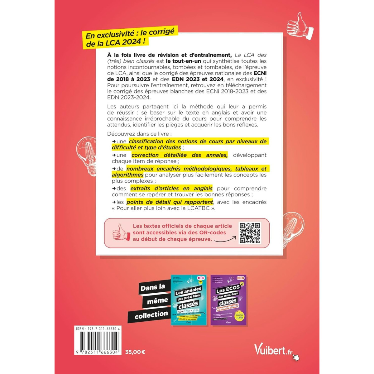 La LCA des (très) bien classés regroupe en un seul volume toutes les notions de cours incontournables, ainsi que les annales des épreuves nationales des EDN 2023 et 2024. Les auteurs y partagent leur méthode pour réussir : se baser sur le texte des articles en anglais et connaître le cours pour comprendre les attendus, identifier les pièges et acquérir les bons réflexes.