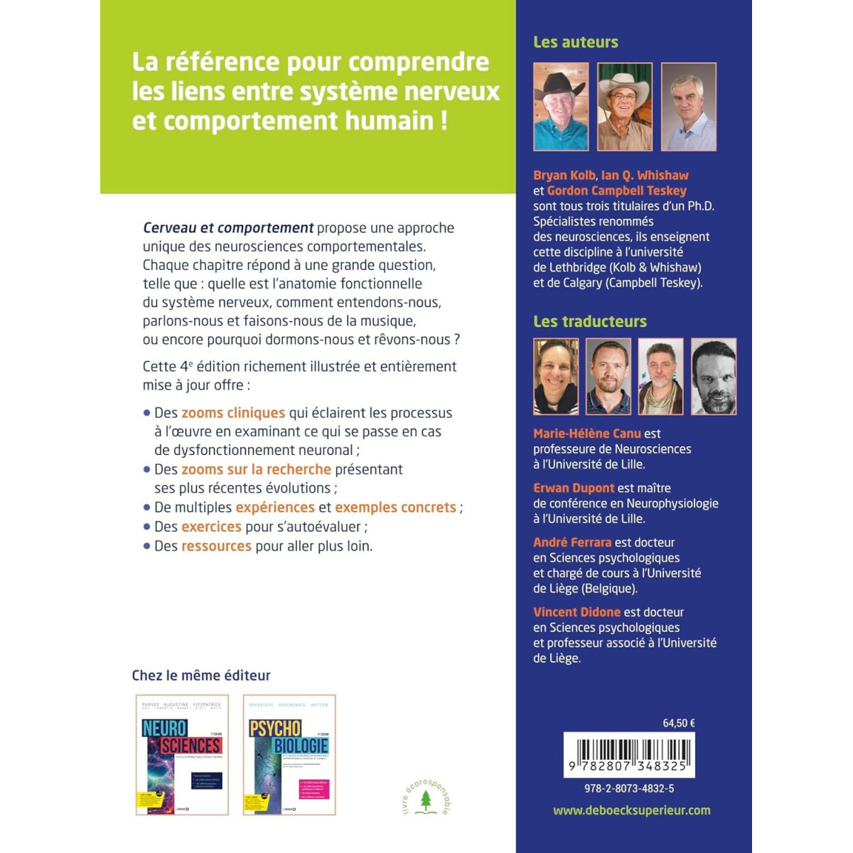 Cette 4e édition richement illustrée et entièrement mise à jour offre : des zooms cliniques qui éclairent les processus à l’œuvre en examinant ce qui se passe en cas de dysfonctionnement neuronal ; des zooms sur la recherche présentant ses plus récentes évolutions ; de multiples expériences et exemples concrets ; des exercices pour s’auto-évaluer ; des ressources pour aller plus loin.