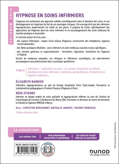 Cet ouvrage, écrit par des infirmiers hypnopraticiens expérimentés, est inédit en son genre. Il propose de traiter spécifiquement des applications de l’hypnose dans les soins infirmiers et en accompagnement des actes médicaux de manière pratique et accessible.