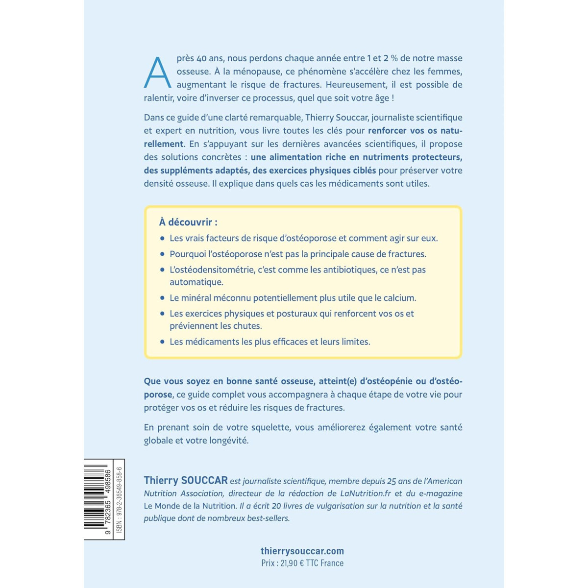 Dans ce guide d’une clarté remarquable, Thierry Souccar, journaliste scientifique et expert en nutrition, vous livre toutes les clés pour renforcer vos os naturellement. En s'appuyant sur les dernières avancées scientifiques, il propose des solutions concrètes : une alimentation riche en nutriments protecteurs, des suppléments adaptés, des exercices physiques ciblés pour préserver votre densité osseuse. Il explique dans quels cas les médicaments sont utiles.