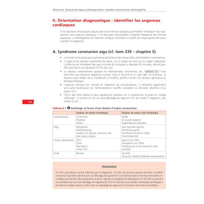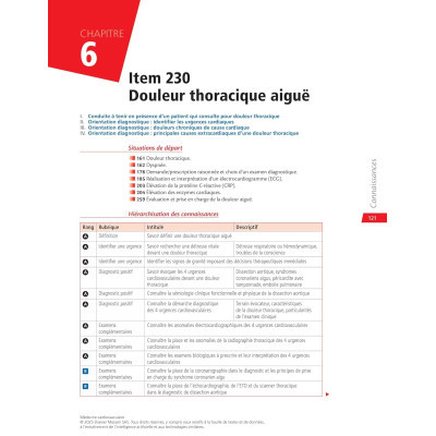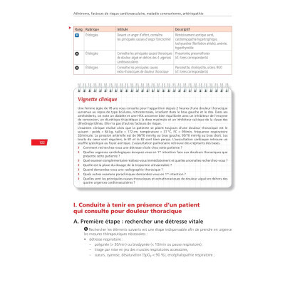• Une partie Connaissances composée de 22 chapitres correspondant chacun à un item de la discipline. Chaque chapitre commence systématiquement par les situations de départ, un tableau de hiérarchisation des connaissances en rangs A B, une vignette clinique, puis développe la thématique avec l'indication des rangs au fil du texte (les rangs C pour aller plus loin sont abordés) étayée de points clés tableaux et figures de rubriques sur les notions à retenir et se termine par des questions isolées avec correction en fin d'ouvrage qui permettent de tester immédiatement ses connaissances sur l'item abordé ;