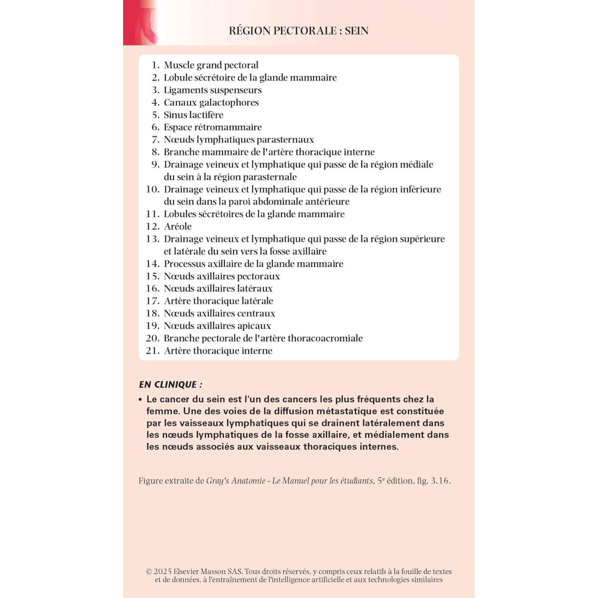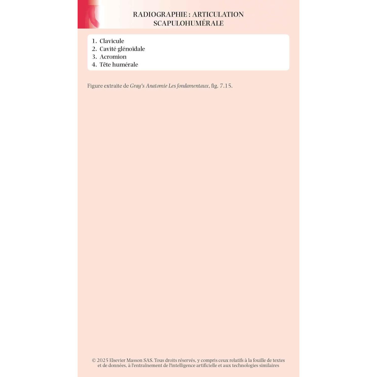 Classées par région, les fiches présentent l'Anatomie et l'Imagerie du dos, du thorax, de l'abdomen, du pelvis et du périnée, du membre supérieur, du membre inférieur, de la tête et du cou, ainsi que l'Anatomie de surface et l'Anatomie générale.