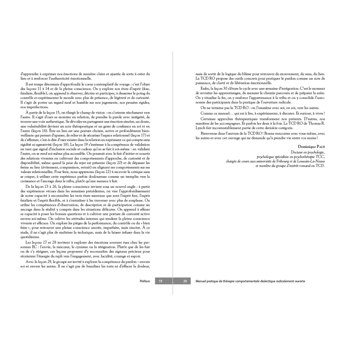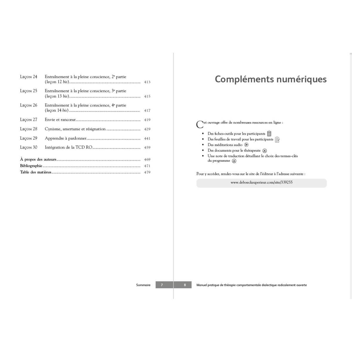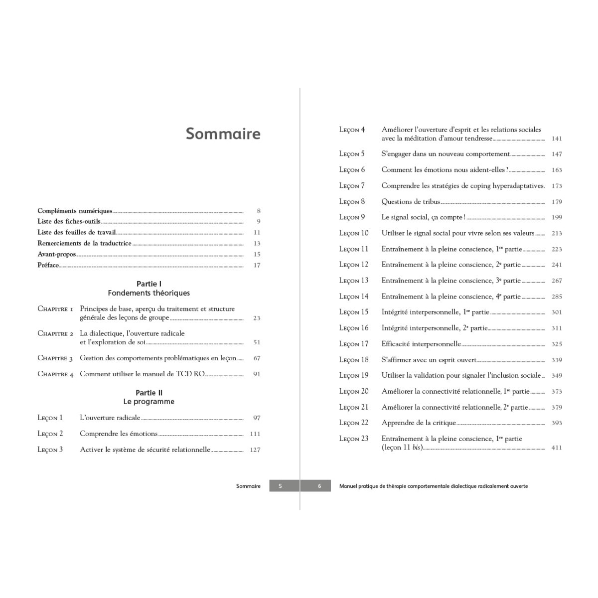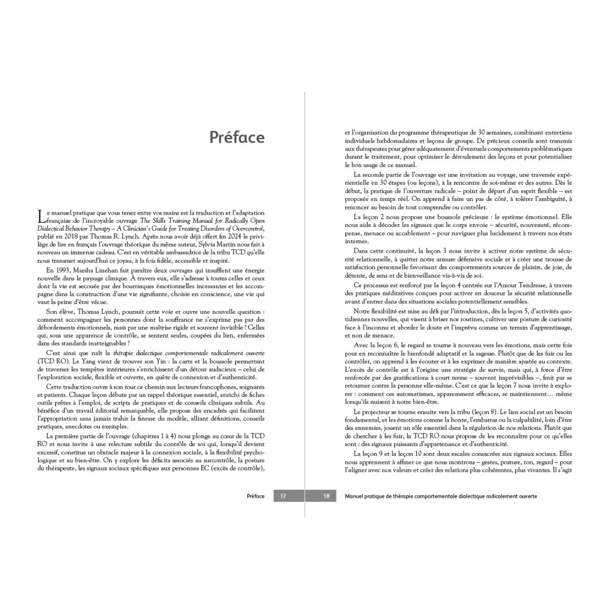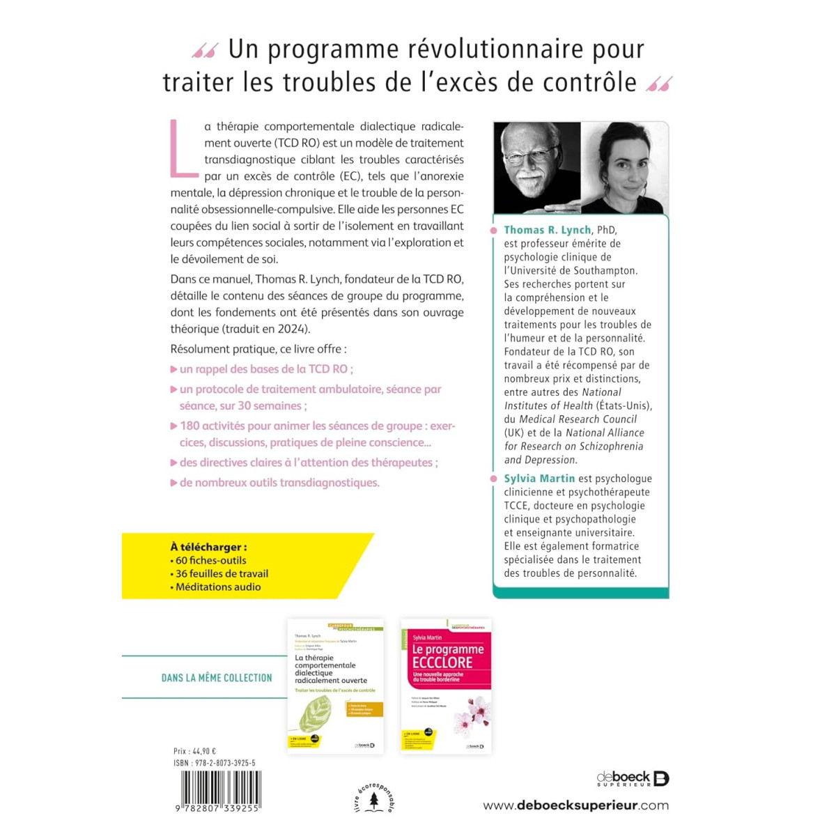 La thérapie comportementale dialectique radicalement ouverte (TCD RO) est un modèle de traitement trans-diagnostique ciblant les troubles caractérisés par un excès de contrôle (EC), tels que l’anorexie mentale, la dépression chronique et le trouble de la personnalité obsessionnelle compulsive (TOC). Elle aide les personnes EC coupées du lien social à sortir de l’isolement en travaillant leurs compétences sociales, notamment via l’exploration et le dévoilement de soi.Dans ce manuel, Thomas R. Lynch, fondateur de la TCD RO, détaille le contenu des séances de groupe du programme, dont les fondements ont été présentés dans son ouvrage théorique (traduit chez De Boeck Supérieur en 2024).