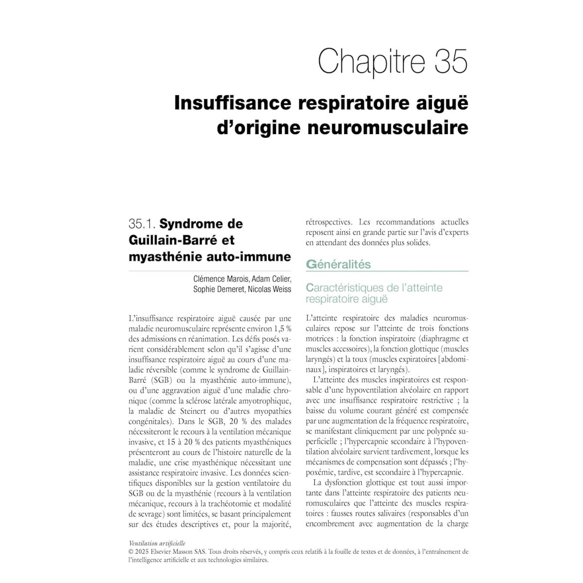 L'ouvrage traite tout d'abord des grands principes physiologiques régissant la ventilation artificielle. Il couvre ensuite les aspects matériels, les modes ventilatoires, les assistances non invasives, ainsi que le monitorage et les outils d'exploration fonctionnelle utilisables au lit des patients. Enfin, l'ouvrage s'arrête sur la prise en charge des principales affections respiratoires aiguës auxquelles sont confrontés les réanimateurs : SDRA, œdème pulmonaire cardiogénique, maladies respiratoires obstructives, patients obèses ou atteints de maladie neuromusculaire, interactions patient-ventilateur difficiles et asynchronies, sevrage simple et difficile de la ventilation, spécificités néonatales et pédiatriques.