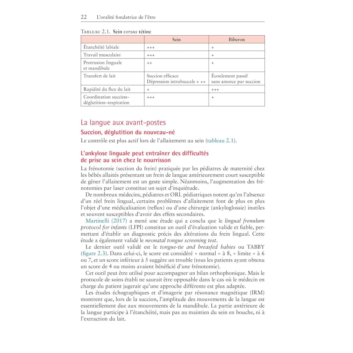 L'autrice élabore une grille de lecture clinique permettant d'affiner la compréhension des troubles de l'oralité. Chez le jeune enfant, elle montre la construction en parallèle de l'oralité verbale et de l'oralité alimentaire, ainsi que leur rôle de guides dans le développement de toutes les sensorialités à travers les systèmes proprioceptif, visuel, auditif, olfactif et gustatif. Ce développement prend en compte son expérience antérieure (oralité primaire et secondaire), ses émotions et son environnement proche.