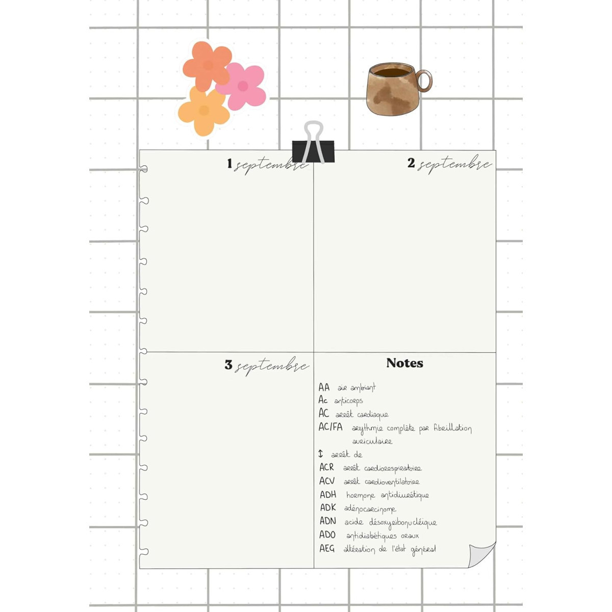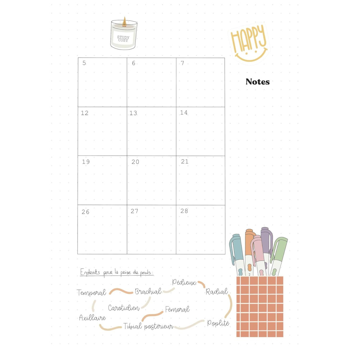 À mi-chemin entre le journal de bord et l'agenda, le Bullet Journal est un outil pratique et ludique qui vous accompagne au quotidien, à la fois dans vos tâches personnelles et professionnelles. Le Bullet Journal, parfois aussi appelé ' Bujo ', laisse libre court à l'imagination et permet de s'organiser selon une méthode précise, efficace et ludique.Aujourd'hui appliqué à l'agenda de l'étudiante aide-soignante ou auxiliaire de puériculture, Mon Bullet Journal AS/AP est un peu tout cela, mais davantage encore... puisqu'il est aussi un véritable outil de révision. En plus de servir d'agenda perpétuel, ce Bujo propose de nombreuses sections conçues pour aider les étudiantes à s'organiser efficacement afin de réussir leurs études, stages et examens. En accord avec la dernière réforme, chaque mois un module est abordé et les rubriques du mois déclinent cette thématique de la façon suivante :