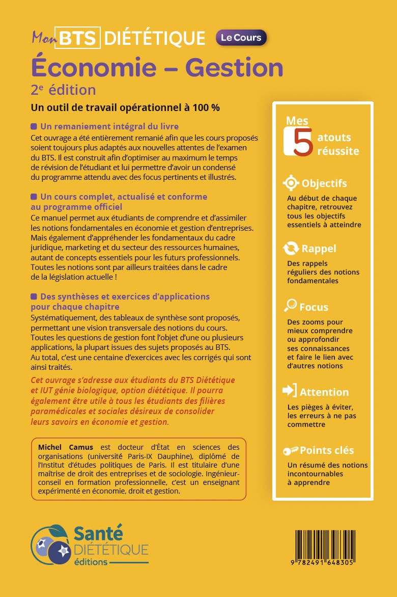 Cibles : cet ouvrage s’adresse aux étudiants du BTS Diététique et IUT Génie biologique, option diététique. Il pourra également être utile à tous les étudiants des filières paramédicales et sociales désireux de consolider leurs savoirs en économie et gestion.
