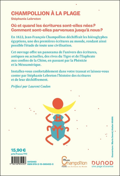 Cet ouvrage offre un panorama de l'univers des écritures, antiques ou actuelles, des rives du Tigre et de l'Euphrate aux confins de la Chine, en passant par la Phénicie et la Mésoamérique. Installez-vous confortablement dans votre transat et laissez-vous conter par Stéphanie Lebreton l'histoire des écritures et de leur déchiffrement, vous allez parcourir six mille ans d’histoire du monde.
