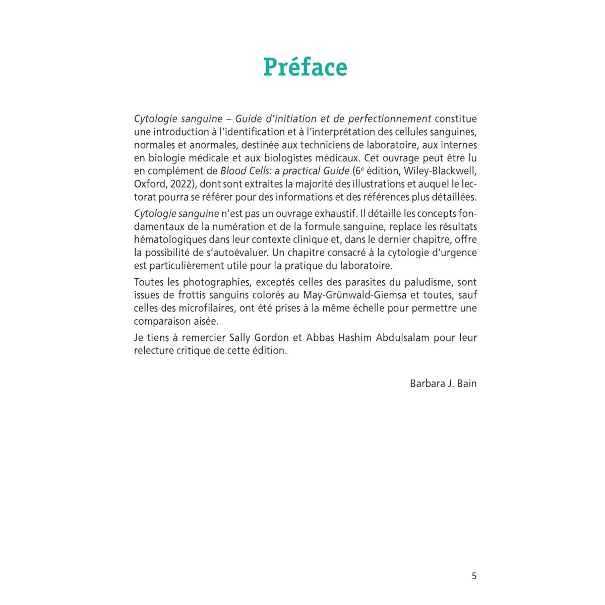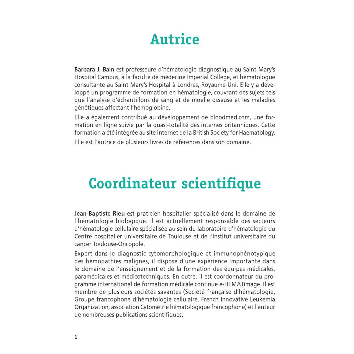 Barbara J. Bain est professeure d’Hématologie diagnostique au Saint Mary’s Hospital Campus, à la faculté de Médecine Imperial College, et hématologue consultante au Saint Mary’s Hospital à Londres, Royaume-Uni. Elle y a développé un programme de formation en Hématologie, couvrant des sujets tels que l’analyse d’échantillons de sang et de moelle osseuse et les maladies génétiques affectant l’hémoglobine. Elle a également contribué au développement de bloodmed.com, une formation en ligne suivie par la quasi-totalité des internes britanniques. Cette formation a été intégrée au site Internet de la British Society for Haematology. Elle est l’autrice de plusieurs livres de références dans son domaine.