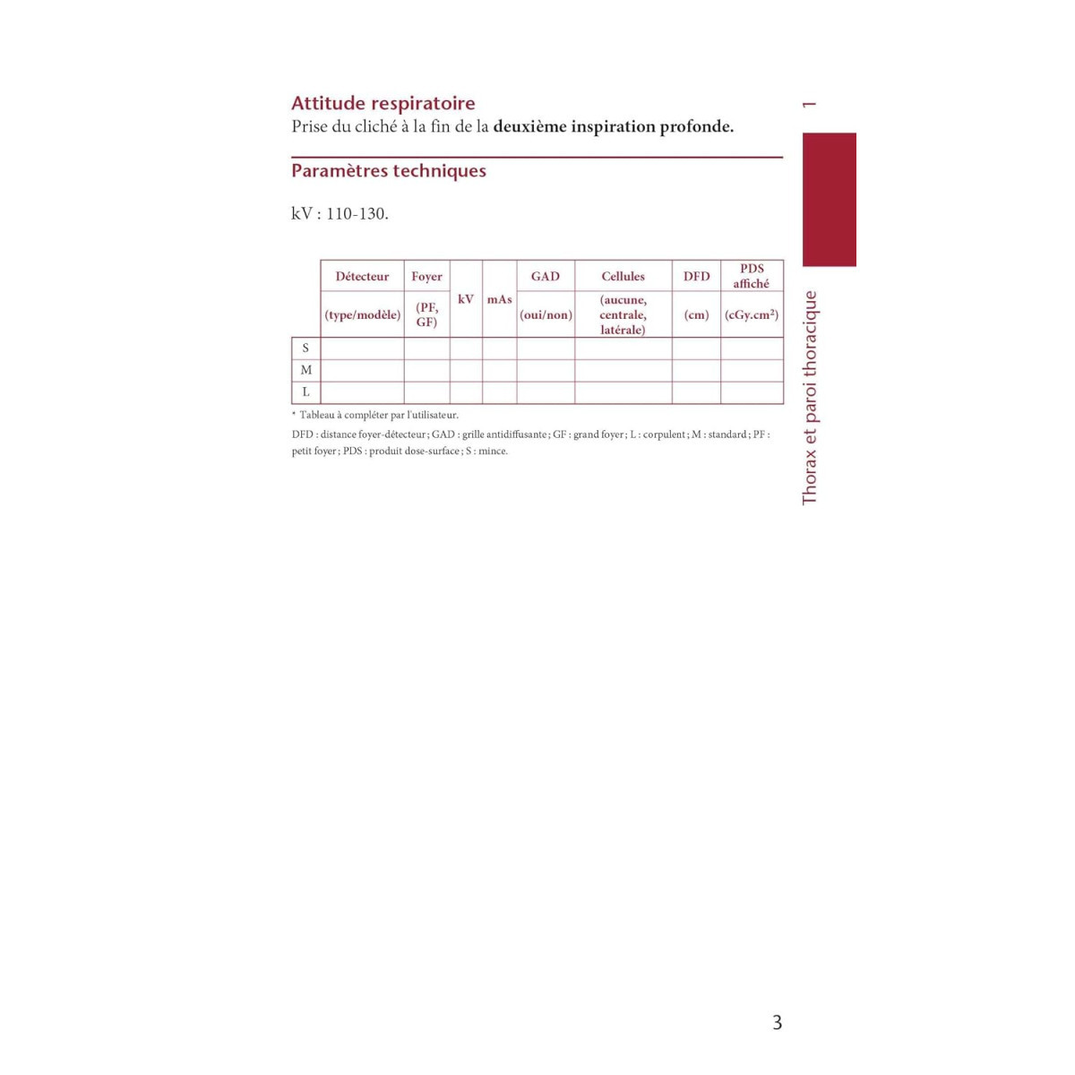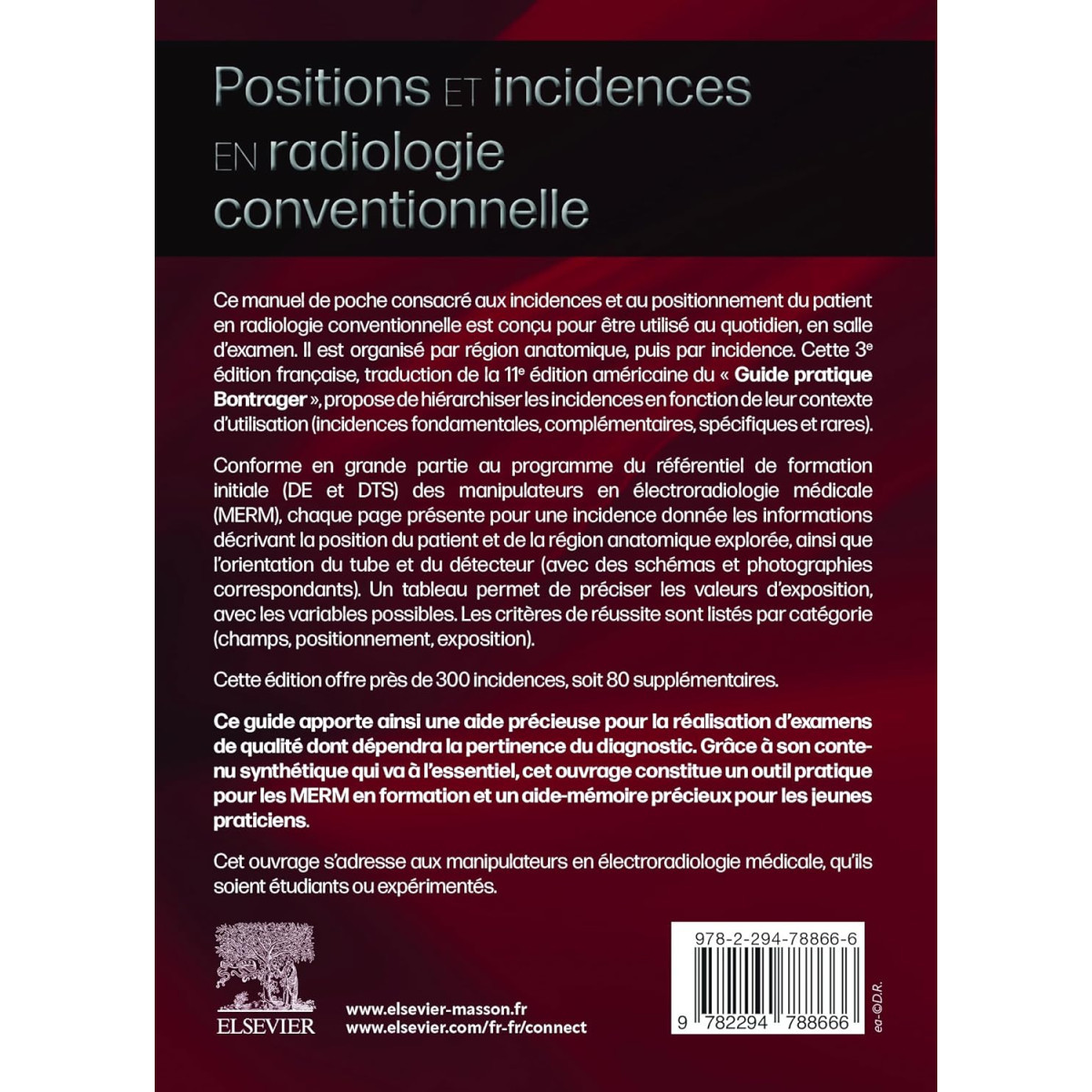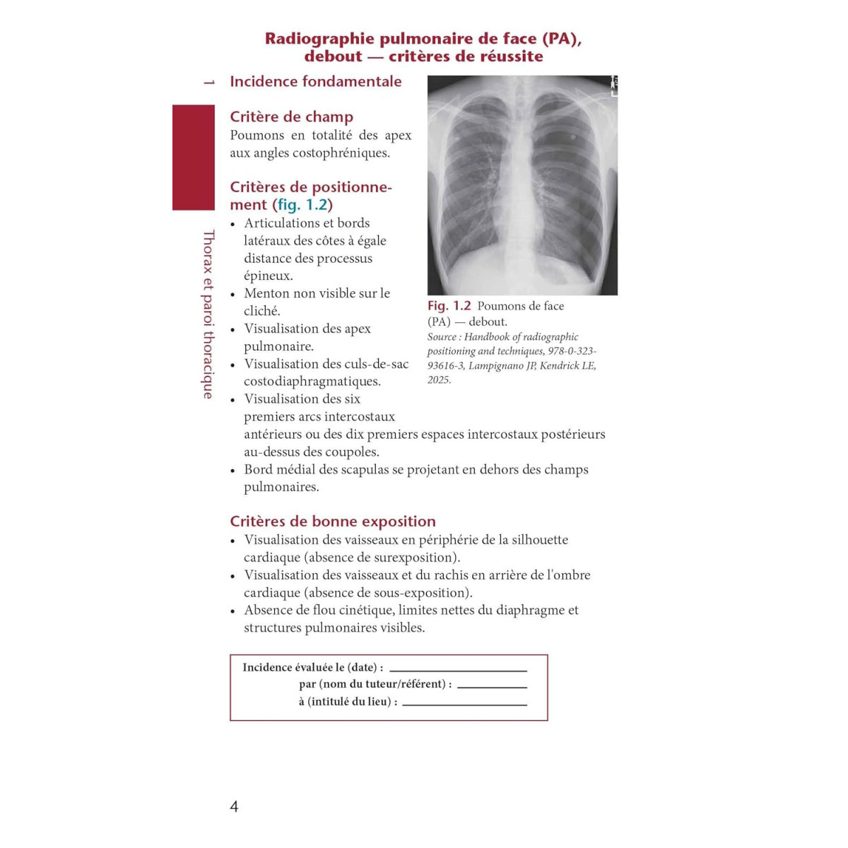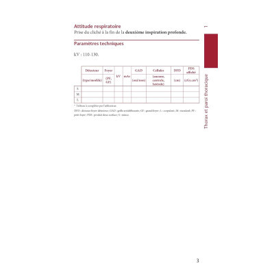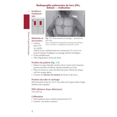 Conforme en grande partie au programme du référentiel de formation initiale (DE et DTS) des manipulateurs en Électroradiologie médicale (MERM), chaque page présente, pour une incidence donnée, les informations décrivant la position du patient et de la région anatomique explorée, ainsi que l'orientation du tube et du détecteur (avec des schémas et photographies correspondants). Un tableau permet de préciser les valeurs d'exposition avec les variables possibles. Les critères de réussite sont listés par catégorie (champs positionnement exposition).