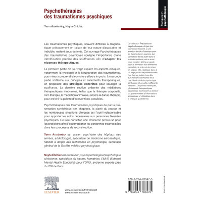 Psychothérapies des traumatismes psychiques, de par la présentation synthétique des chapitres, la clarté du propos et les nombreuses situations cliniques, est l'outil indispensable pour apporter les soins nécessaires aux personnes blessées psychiques. Ce livre constitue une ressource précieuse pour les praticiens afin d'accompagner les personnes traumatisées dans leur processus de reconstruction.