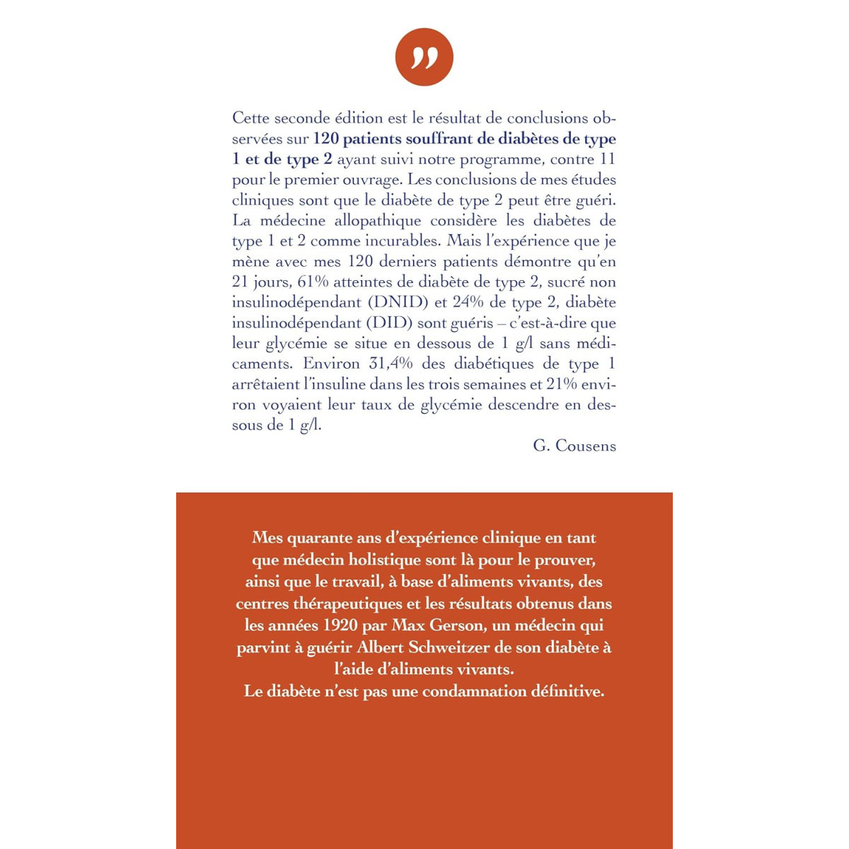 Gabriel Cousens, médecin, homéopathe et expert en Médecines naturelles, a traité pendant trente ans et avec succès un grand nombre de patients souffrant de diabète.