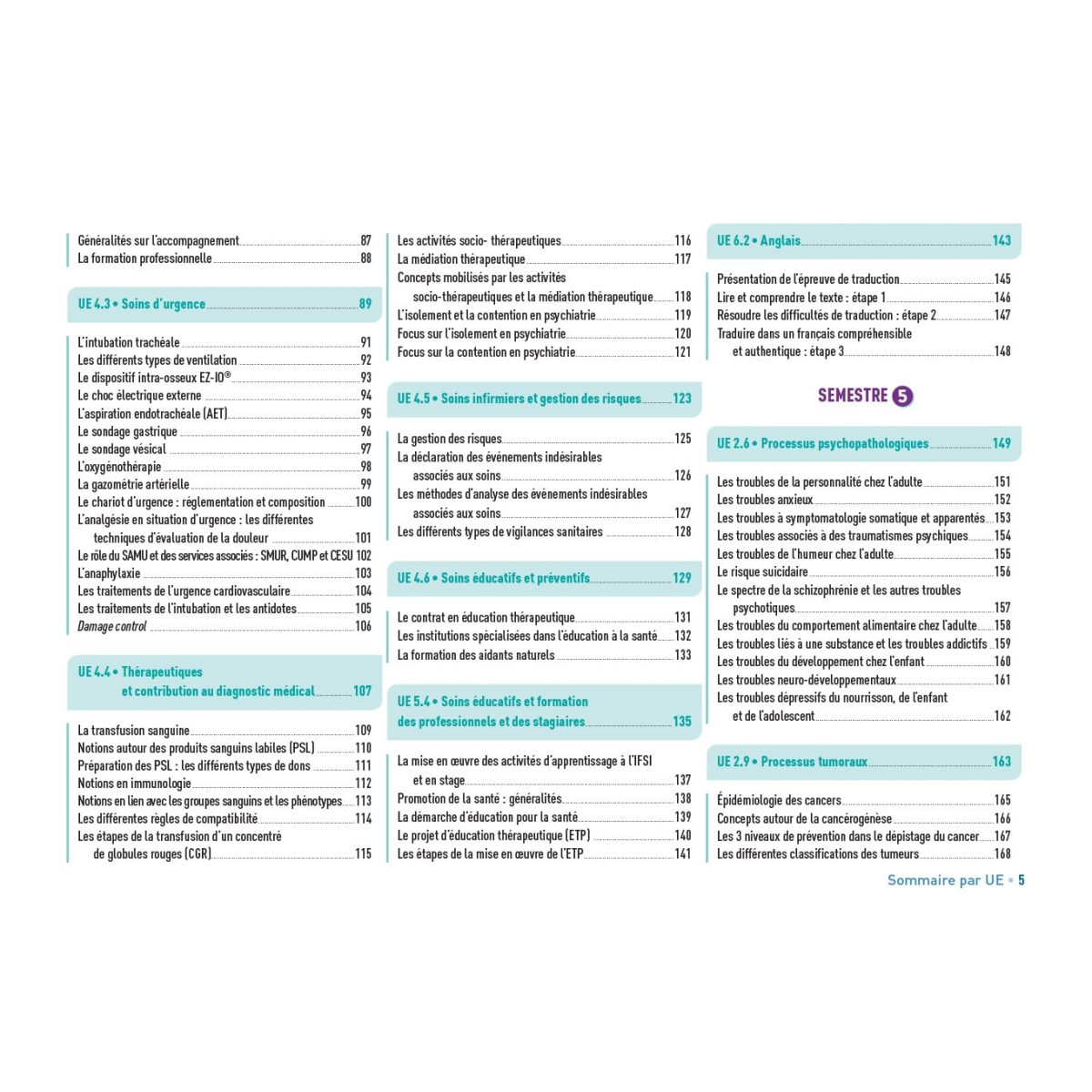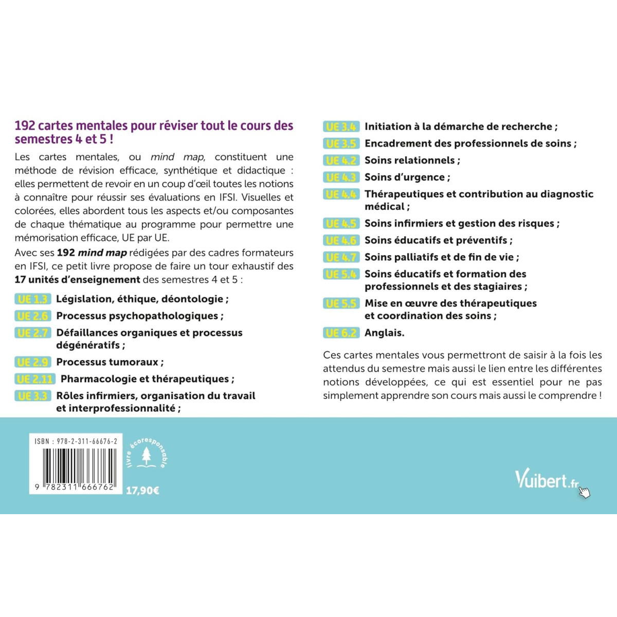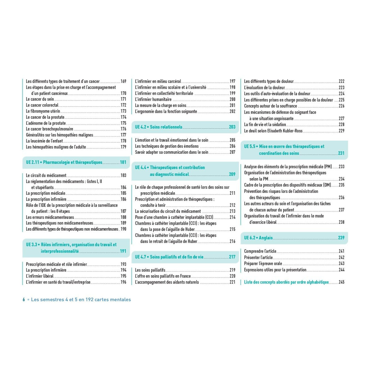 Avec ses 192 mind map rédigées par des cadres formateurs en IFSI, ce petit livre propose de faire un tour exhaustif des 17 unités d'enseignement des semestres 4 et 5 : UE 1. 3 Législation, éthique, déontologie ; UE 2. 6 Processus psychopathologiques ; UE 2. 7 Défaillances organiques et processus dégénératifs ; UE 2. 9 Processus tumoraux ; UE 2. 11 Pharmacologie et thérapeutiques ; UE 3. 3 Rôles infirmiers, organisation du travail et interprofessionnalité ; UE 3. 4 Initiation à la démarche de recherche ; UE 3. 5 Encadrement des professionnels de soins ; UE 4. 2 Soins relationnels ; UE 4. 3 Soins d'urgence ; UE 4. 4 Thérapeutiques et contribution au diagnostic médical ; UE 4. 5 Soins infirmiers et gestion des risques ; UE 4. 6 Soins éducatifs et préventifs ; UE 4. 7 Soins palliatifs et de fin de vie ; UE 5. 4 Soins éducatifs et formation des professionnels et des stagiaires ; UE 5. 5 Mise en œuvre des thérapeutiques et coordination des soins ; UE 6. 2 Anglais.