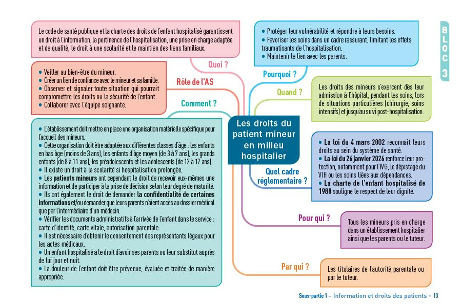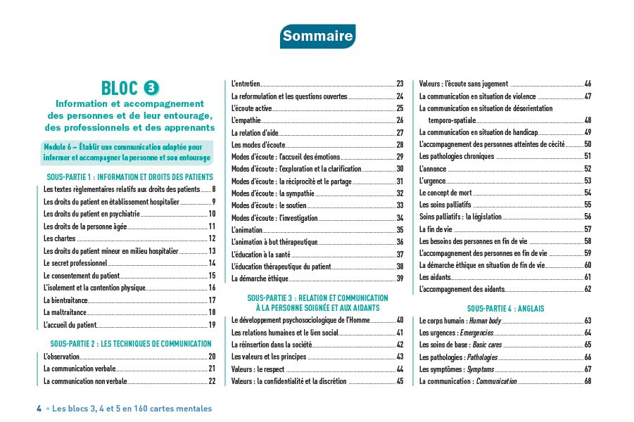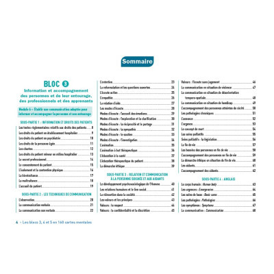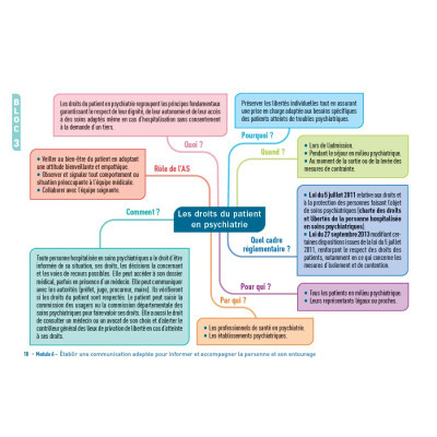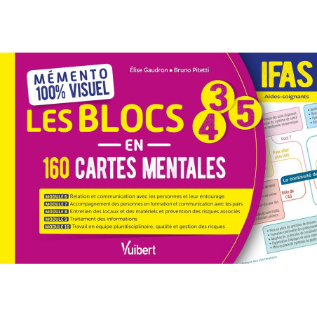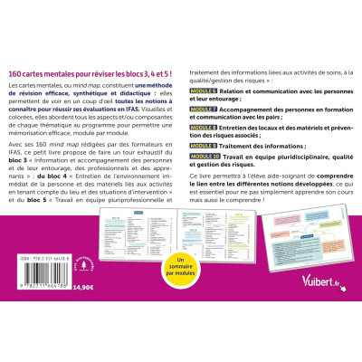 Les cartes mentales, ou mind map, constituent une méthode de révision efficace, synthétique et didactique : elles permettent de voir en un coup d’œil toutes les notions à connaître pour réussir ses évaluations en IFAS. Visuelles et colorées, elles abordent tous les aspects et/ou composantes de chaque thématique au programme pour permettre une mémorisation efficace, module par module.Avec ses 160 mind map rédigées par des formateurs en IFAS, ce petit livre propose de faire un tour exhaustif du bloc 3 « Information et accompagnement des personnes et de leur entourage, des professionnels et des apprenants » ; du bloc 4 « Entretien de l’environnement immédiat de la personne et des matériels liés aux activités en tenant compte du lieu et des situations d’intervention » et du bloc 5 « Travail en équipe pluriprofessionnelle et traitement des informations liées aux activités de soins, à la qualité/gestion des risques » :