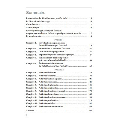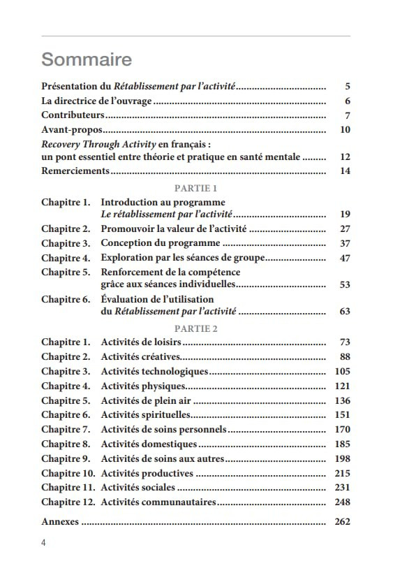 · Des chapitres d’activités classées par domaines occupationnels (technologie, spiritualité, vie sociale, activités de soins personnels, loisirs, etc.) ;