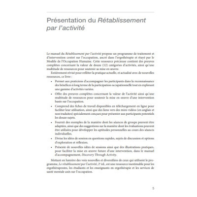 Ce manuel guide les professionnels pas-à-pas : description de la valeur de l’activité basée sur des données probantes, propositions de contenus pour les séances, et suivi des effets dans le temps. Il offre :