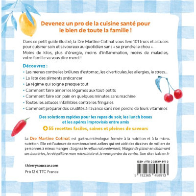 Dans ce petit guide illustré, la Dre Martine Cotinat vous livre 101 trucs et astuces pour cuisiner sain et savoureux au quotidien sans « se prendre le chou ». Moins de kilos, plus d’énergie, moins d’inflammation, moins de maladies, votre famille va vous dire merci !