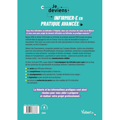 Vous êtes infirmière à l’hôpital, dans une structure de soins ou en libéral et vous avez pour projet de devenir infirmière en pratique avancée ?Depuis 2019, le métier d’infirmière en pratique avancée (IPA) occupe une place centrale dans le paysage du soin en France. Il est au cœur de l’actualité et toujours en mouvement. Pour avoir une vision claire de cette spécialisation et trouver toutes les dernières avancées, un livre s’imposait !