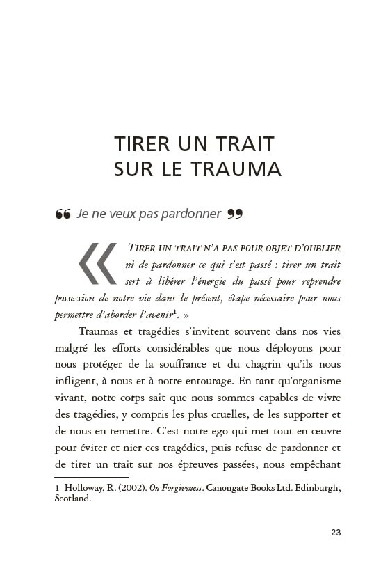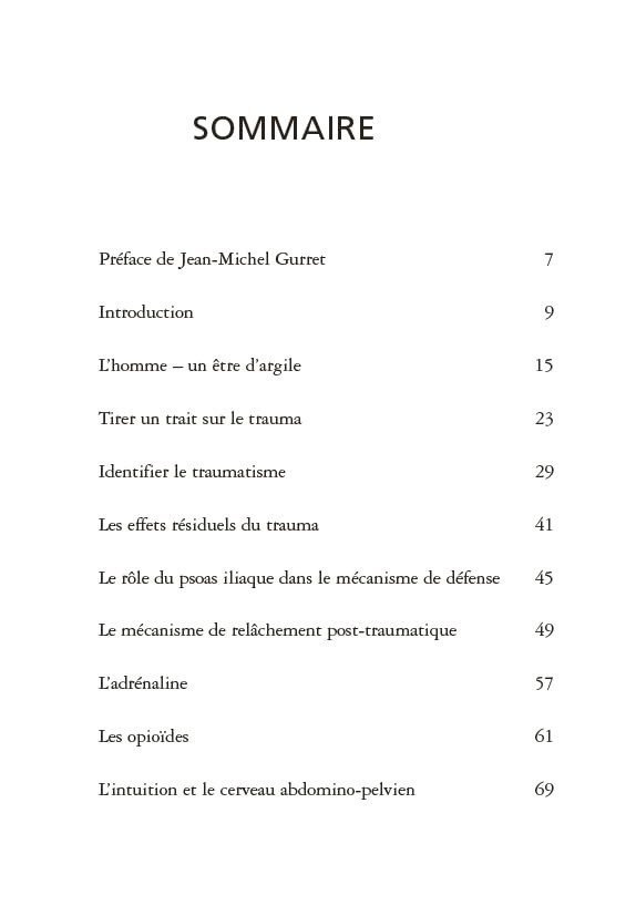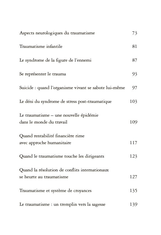 Ce livre présente une méthode de guérison des traumatismes psycho-corporels fondée sur des exercices simples qui déclenchent un réflexe naturel de tremblement, comme celui que l’on observe chez les animaux après un stress. Ce mécanisme, présent en chacun de nous, permet au corps de libérer les tensions accumulées sans avoir besoin de parler ou de revivre l’événement traumatique.
