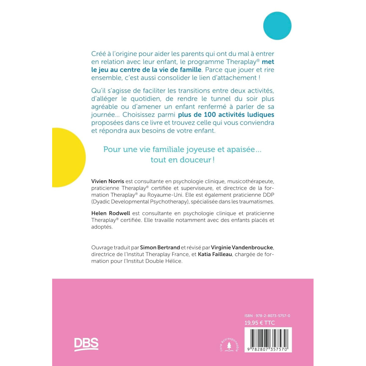 Ouvrage traduit par Simon Bertrand et révisé par Virginie Vandenbroucke, directrice de l’Institut Theraplay® France, et Katia Failleau, chargée de formation pour l’Institut Double Hélice.