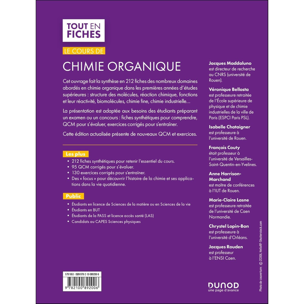 Cet ouvrage fait la synthèse en 212 fiches des nombreux domaines abordés en Chimie organique dans les premières années d’études supérieures : structure des molécules, réaction chimique, fonctions et leur réactivité, biomolécules, Chimie fine, Chimie industrielle…