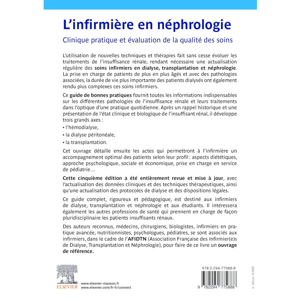 Des auteurs reconnus, médecins, chirurgiens, biologistes, Infirmiers en Pratique Avancée, nutritionnistes, psychologues, pédiatres se sont associés aux infirmiers dans le cadre de l'AFIDTN (Association Française des Infirmier(e)s de Dialyse Transplantation et Néphrologie) pour faire de ce livre un ouvrage de référence.
