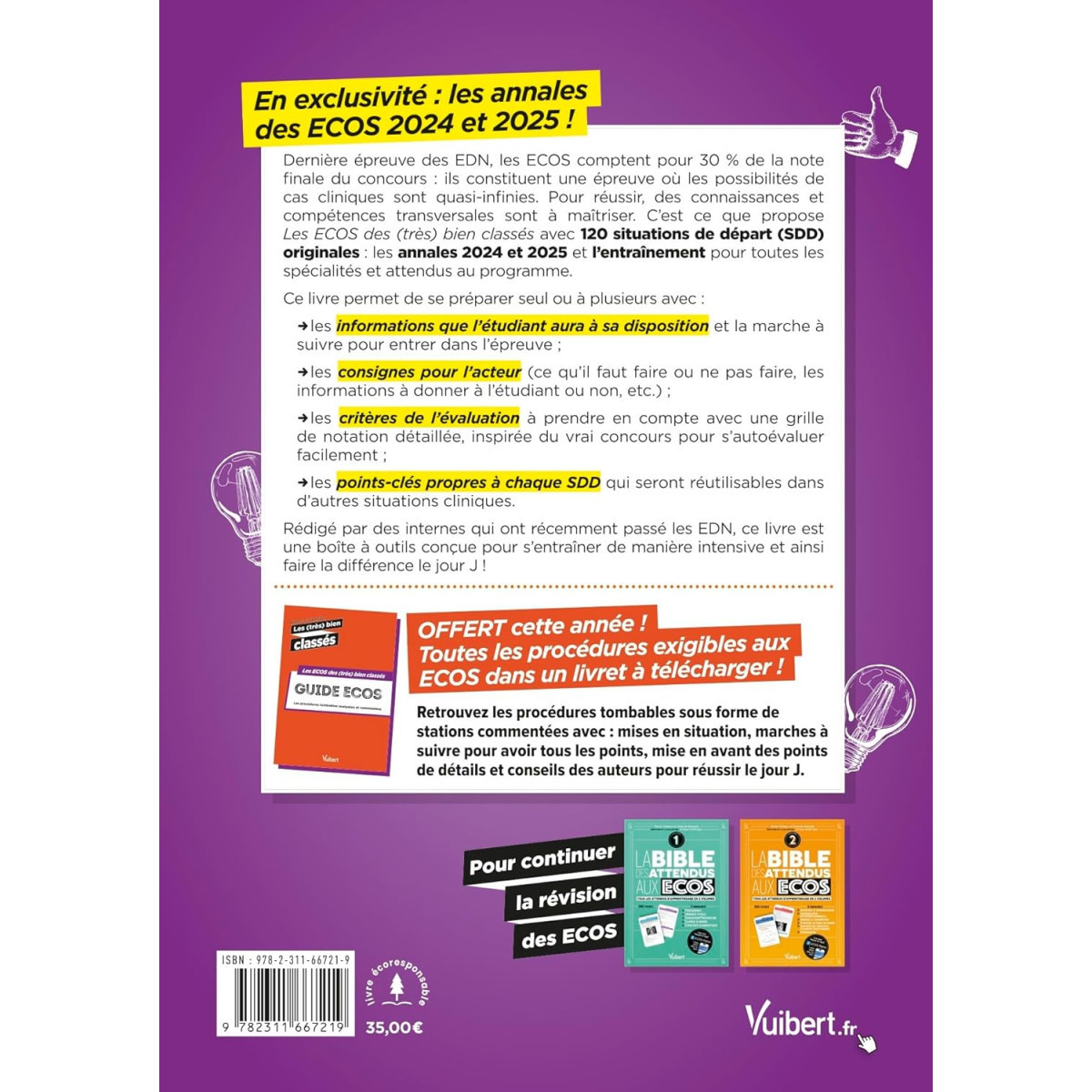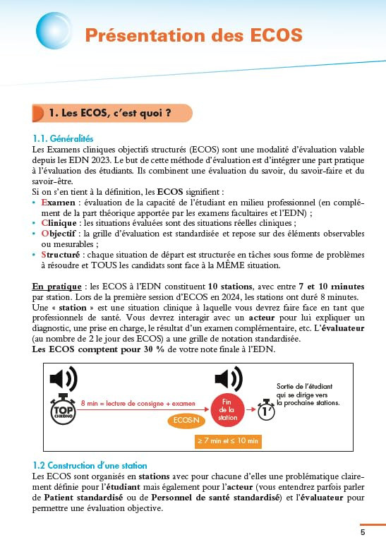 Dernière épreuve des EDN, les ECOS comptent pour 30% de la note finale du concours : ils constituent une épreuve où les possibilités de cas cliniques sont quasi infinies. Pour réussir, des connaissances et compétences transversales sont à maîtriser. C'est ce que propose Les ECOS des (très) bien classés avec 120 situations de départ (SDD) originales : les annales 2024 et 2025 et l'entraînement pour toutes les spécialités et attendus au programme.Ce livre permet de se préparer seul ou à plusieurs avec :