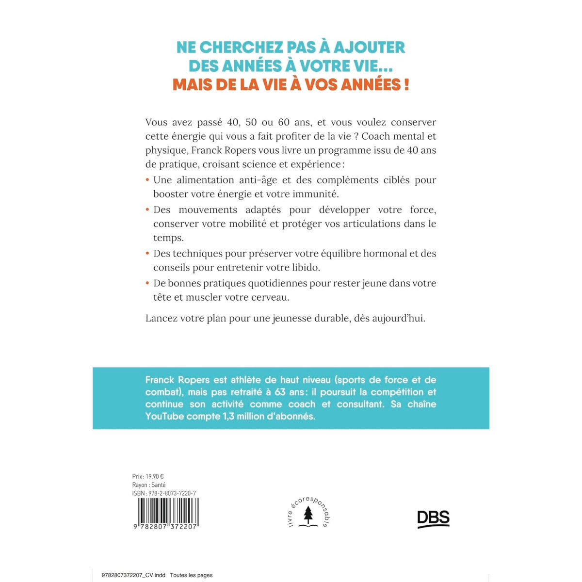 Vous avez passé 40, 50 ou 60 ans, et vous voulez conserver cette énergie qui vous a fait profiter de la vie ? Coach mental et physique, Franck Ropers vous livre un programme issu de 40 ans de pratique, croisant science et expérience :- Une alimentation anti-âge et des compléments ciblés pour booster votre énergie et votre immunité.