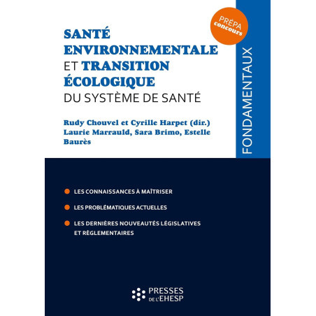 La santé environnementale comme la transition écologique, désormais au programme des épreuves des concours de l'École des hautes études en Santé publique (EHESP), ne peuvent être écartées du fonctionnement du système de santé et des établissements et structures qui le composent. En leur fournissant des clés de compréhension et des repères pour penser la santé dans une perspective durable, cet ouvrage s'adresse aux étudiants préparant les concours de l'EHESP. Il intéressera également les professionnels de santé soucieux d'intégrer les dimensions environnementales dans leurs pratiques, leurs décisions et leurs engagements et, plus largement, celles et ceux qui souhaitent conjuguer expertise sanitaire et responsabilité écologique.