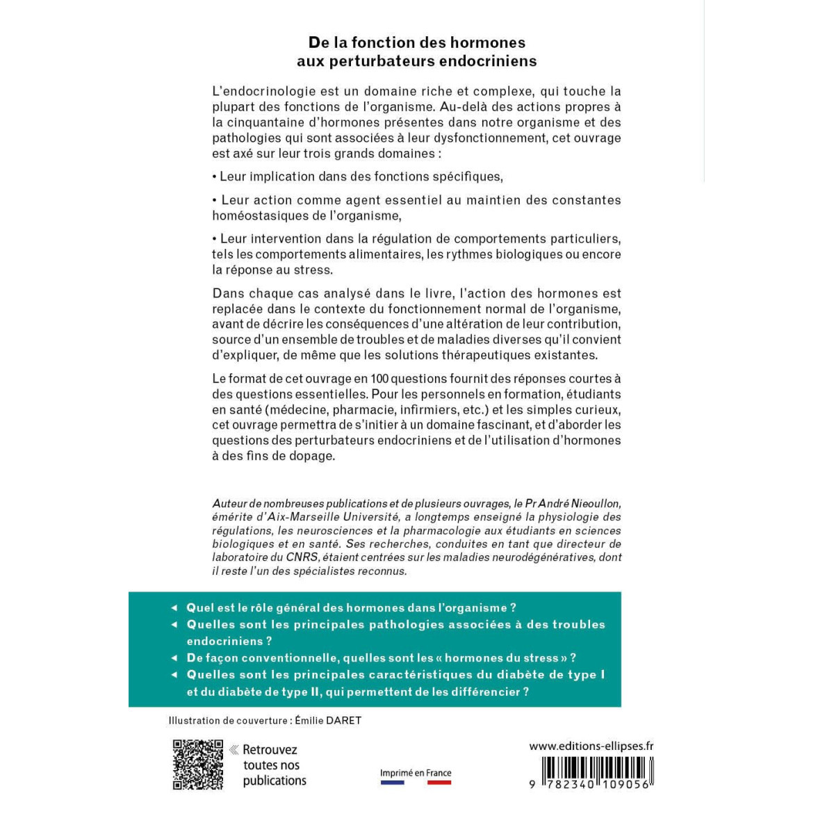 Le format de cet ouvrage en 100 questions fournit des réponses courtes à des questions essentielles, permettant de couvrir ce large domaine tout en incitant le lecteur à aller plus loin dans des ouvrages plus spécifiques. Pour les personnels en formation, étudiants en santé notamment (Médecine, Pharmacie, infirmiers, etc.) et pour les simples curieux, cet ouvrage permettra de s’initier à un domaine fascinant, méritant un approfondissement, et d’aborder les questions des perturbateurs endocriniens et de l’utilisation d’hormones à des fins de dopage.