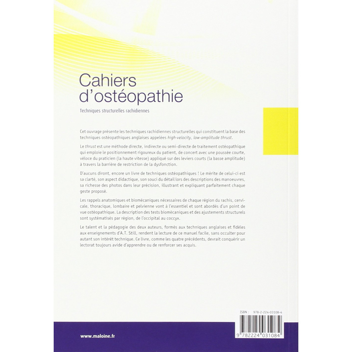 Cet ouvrage présente les techniques rachidiennes structurelles qui constituent la base des techniques ostéopathiques anglaises appelées high-velocity, low-amplitude thrust. Le thrust est une méthode directe, indirecte ou semi-directe de traitement ostéopathique qui emploie le positionnement rigoureux du patient, de concert avec une poussée courte, véloce du praticien [la haute vitesse) appliqué sur des leviers courts a basse amplitude) à travers la barrière de restriction de la dysfonction. Les rappels anatomiques et biomécaniques nécessaires de chaque région du rachis, cervicale, thoracique, lombaire et pelvienne vont à l'essentiel et sont abordés d'un point de vue ostéopathique. La description des tests biomécaniques et des ajustements structurels sont systématisés par région, de l'occipital au coccyx.