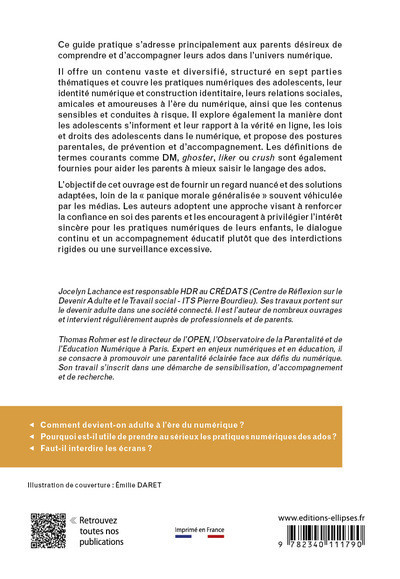 Ce guide pratique offre un contenu vaste et diversifié, structuré en sept parties thématiques et couvre les pratiques numériques des adolescents, leur identité numérique et construction identitaire, leurs relations sociales, amicales et amoureuses à l'ère du numérique, ainsi que les contenus sensibles et conduites à risque. Il explore également la manière dont les adolescents s'informent et leur rapport à la vérité en ligne, les lois et droits des adolescents dans le numérique, et propose des postures parentales, de prévention et d'accompagnement. Les définitions de termes courants comme DM, ghoster, liker ou crush sont également fournies pour aider les parents à mieux saisir le langage des ados.