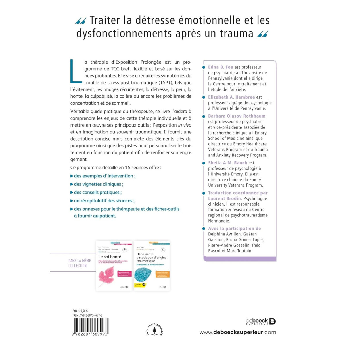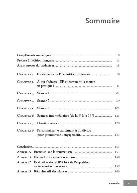 Véritable guide pratique du thérapeute, ce livre l’aidera à comprendre les enjeux de cette thérapie individuelle et à mettre en œuvre ses principaux outils : l’exposition in vivo et en imagination au souvenir traumatique. Il fournit une description concise mais complète des éléments clés du programme, ainsi que des pistes pour personnaliser le traitement en fonction du patient afin de renforcer son engagement.