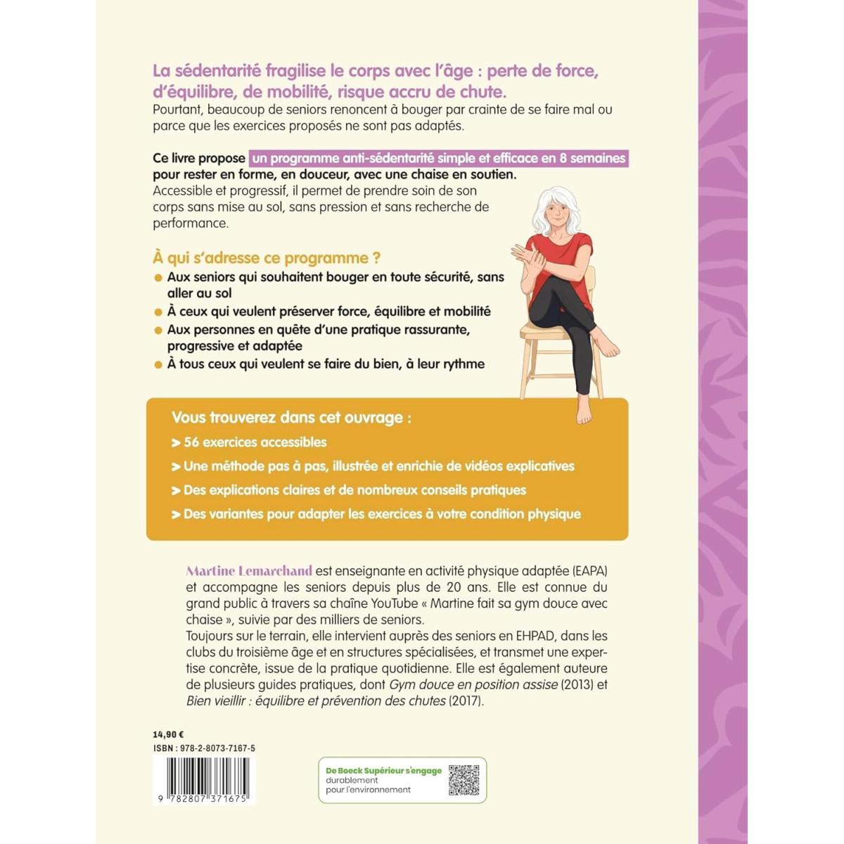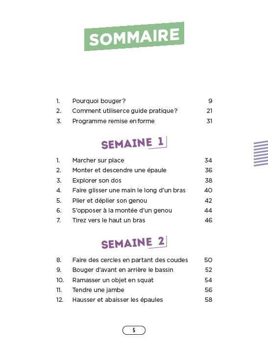 Vous souhaitez être en meilleure forme au quotidien, pour préserver votre autonomie et votre qualité de vie ? Vous voulez un programme d'entretien sollicitant la mobilité, la force, la souplesse et l'équilibre, à pratiquer chez vous, avec une simple chaise ? Lisez ce livre pour découvrir le programme sur 30 jours pour se remettre en forme. Entraînez-vous régulièrement pour créer une routine et cette assiduité permettra d'obtenir les résultats que vous attendez !Ce livre d'activité physique adapté, avec une simple chaise, permet de limiter la sédentarité de façon simple et ludique. Vous trouverez toute l'aide nécessaire avec 56 exercices sur 3 séances par semaine pendant 56 jours :