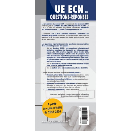 Le programme du nouvel ECN sera appliqué dès la rentrée 2013 pour le cycle de DFASM1 de 2013-2014 et pour l'ECN 2016. Le CNCI a créé un nouveau programme comportant désormais 362 items répartis en 13 Unités d'Enseignement ou UE. La collection "UE ECN en Questions-Réponses" conforme à ce nouveau programme correspond à un entraînement sous forme de questions et de réponses pouvant être réalisé seul ou dans le cadre de vos sous-colles. Les questions répertoriées sont les questions incontournables de la spécialité pouvant être posées : soit en dossiers QCM : ces questions volontairement limitatives ayant pour but d'acquérir le "réflexe connaissance". En effet, avant de répondre à tout dossier QCM, l'étape méthodologique initiale sera de proposer sur votre brouillon les hypothèses justes sans regarder les réponses. Ce point méthodologique essentiel vous évitera d'être emporté dans un raisonnement erroné proposé par les correcteurs. Soit en dossiers de partiels dont certains resteront encore sous forme de questions ouvertes. Soit en partiels avec les questions sous forme de QROC. Chaque chapitre sera ainsi structuré en trois parties : Zéros et "choix QCM" incontournables : les zéros à écrire sur votre brouillon et les choix QCM à cocher en priorité. Questions et énoncés "QCM types" : les questions incontournables de la spécialité. Réponses et affirmations "QCM types" (avec mots-clés, difficultés et coaching) : les réponses aux questions incontournables présentées de façon claire et précise. Coaching d'assimilation : pour s'auto-évaluer. Nous vous souhaitons à tous une excellente préparation à ces nouvelles modalités de concours !