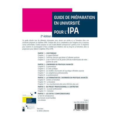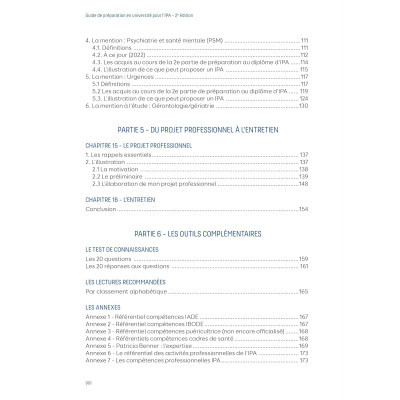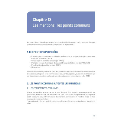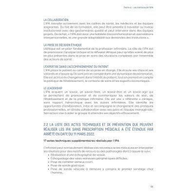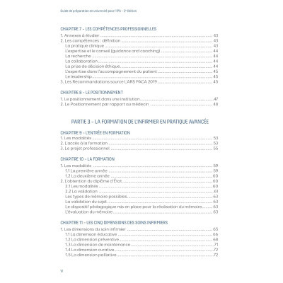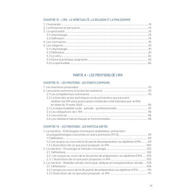 - Partie 3 - La formation de l’Infirmier en Pratique Avancée ; Chapitre 9 - L’entrée en formation ; Chapitre 10 - La formation ; Chapitre 11 - Les cinq dimensions des soins infirmiers ; Chapitre 12- L'IPA : la spiritualité, la religion et la philosophie