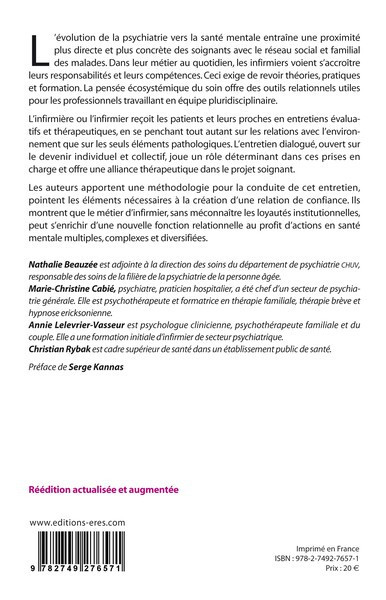 Les auteurs apportent une méthodologie pour sa conduite, pointent les éléments nécessaires à la création d’une relation de confiance. Ils montrent de manière très pédagogique que le métier d’infirmier, sans méconnaître les loyautés institutionnelles, peut s’enrichir d’une nouvelle fonction relationnelle au profit d’actions en santé mentale multiples, complexes et diversifiées.
