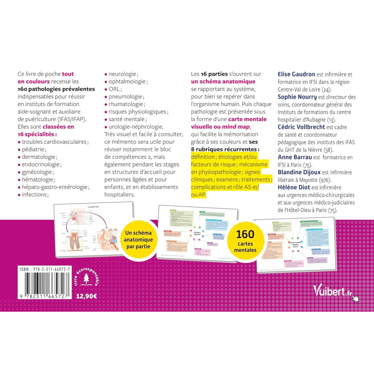 Ce petit livre tout en couleurs recense les 160 pathologies prévalentes indispensables pour réussir en Instituts de formation aide-soignant et auxiliaire de Puériculture. Elles sont organisées en 16 spécialités : troubles cardiovasculaires, Pédiatrie ; Dermatologie ; Endocrinologie ; Gynécologie-Obstétrique ; Hématologie ; Hépato-Gastro-Entérologie ; infections ; Neurologie ; Ophtalmologie ; ORL ; Pneumologie ; risques physiologiques ; Rhumatologie ; Santé mentale ; Urologie-Néphrologie.