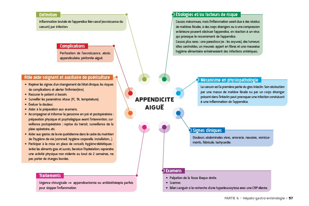 Un schéma anatomique se rapportant au système concerné ouvre les parties, pour bien se repérer dans l'organisme humain. Chaque pathologie est présentée sous la forme d'une carte mentale visuelle, ou mind map, qui facilite la mémorisation grâce à ses couleurs et ses 8 rubriques récurrentes : définition ; étiologies et/ou facteurs de risque ; mécanisme en Physiopathologie ; signes cliniques ; examens ; traitements ; complications ; rôle AS et/ou AP.