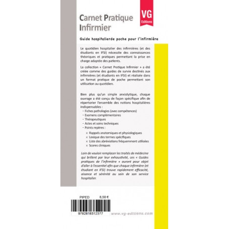 Le quotidien hospitalier des infirmières (et des étudiants en IFSI) nécessite des connaissances théoriques et pratiques permettant la prise en charge adaptée des patients. La collection "Carnet Pratique Infirmier" a été créée comme des guides de survie destinés aux infirmières (et étudiants en IFSI) et réalisés dans un format pratique de poche permettant leur utilisation au quotidien.