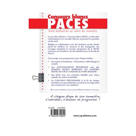 La nouvelle collection « Concours blancs PACES » a été créée conformément à la nouvelle réforme concernant la première année santé. Rédigés en collaboration avec des étudiants arrivés classés parmi les meilleurs au concours et des enseignants, ces ouvrages respectent le nouveau programme de la PACES ? commune aux facultés et ont été optimisés pour la faculté de Paris 6. Cet ouvrage vous propose ainsi, pour chaque matière : Une partie d'introduction : informations, méthodologie etconseils Une AUTO-EVALUATION PROGRESSIVE avec des EXAMENS BLANCS REPRENANT LES CHAPITRES TRAITES AU FUR ET A MESURE DE VOTRE SEMESTRE Des QCM avec une correction détaillée pour mieux assimiler les notions essentielles Un COACHING PERSONNALISE à la fin de chaque évaluation vous permettant de vous situer et vous apportant des conseils pour vous améliorer. Nous vous souhaitons à tous une excellente réussite au concours.