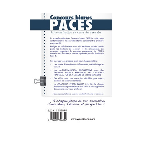 La nouvelle collection "Concours blancs PACES" a été créée conformément à la nouvelle réforme concernant la première année santé. Rédigés en collaboration avec des étudiants arrivés classés parmi les meilleurs au concours et des enseignants, ces ouvrages respectent le nouveau programme du PACES commun aux facultés et ont été optimisés pour la faculté de Paris 6. Cet ouvrage vous propose ainsi, pour chaque matière : une partie d'introduction (informations, méthodologie et conseils) ; une auto-evaluation progressive avec des examens blancs reprenant les chapitres traités au fur et à mesure de votre semestre ; des QCM avec une correction détaillée pour mieux assimiler les notions essentielles ; un coaching personnalisé à la fin de chaque évaluation vous permettant de vous situer et vous apportant des conseils pour vous améliorer. Nous vous souhaitons à tous une excellente réussite au concours.