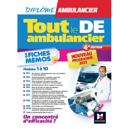 Un format bloc pratique et nomade pour réviser partout et réussir son diplôme ! Au sommaire : Module 1 : Relation et communication avec les patients et leur entourage ; Module 2 : Accompagnement du patient dans son installation et ses déplacements ; Module 3 : Mise en œuvre des soins d’hygiène et de confort adaptés et réajustement ; Module 4 : Appréciation de l'état clinique du patient ; Module 5 : Mise en œuvre de soins notamment ceux relevant de l’urgence ; Module 6 : Préparation, contrôle et entretien du véhicule adapté au transport sanitaire terrestre ; Module 7: Conduite du véhicule adapté au transport sanitaire terrestre dans le respect des règles de circulation et de sécurité routière et de l’itinéraire adapté à l’état de santé du patient ; Module 8 : Entretien du matériel et des installations du véhicule adapté au transport sanitaire terrestre et prévention des risques associés ; Module 9 : Traitement des informations ; Module 10 : Travail en équipe pluriprofessionnelle, qualité et gestion des risques.